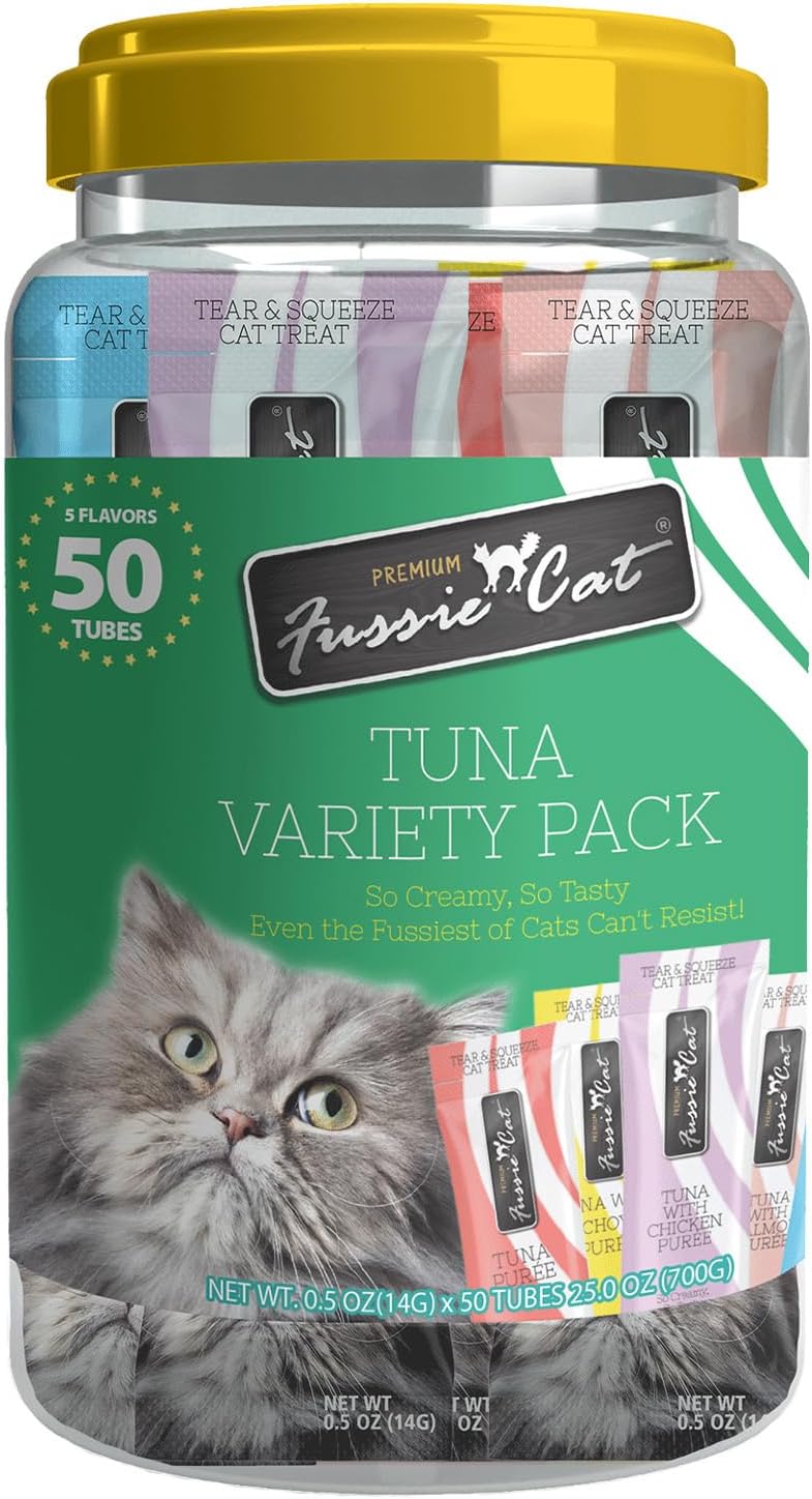 Say hello to the ultimate lickable treat experience! Fussie Cat Purée Treats are now available in a convenient 50-count tub—so you’ll always have their favorite treats on hand. Whether your cat craves fish-forward or poultry-paired purées, this variety pack features a range of Fussie Cat favorites designed to satisfy even the fussiest felines. Tuna today, chicken tomorrow—our purée tub has a flavor for every mood, moment, and meow. This pack delivers more of what your cat loves in a convenient, easy-to-store container. Join the flavor revolution and keep your cat curious—grab the Fussie Cat Purée Treat Tub today before the tails start lining up! Why Cats (and Pet Parents) Love Them: -50-count variety tub with individually wrapped, easy-to-serve purée treat tubes -Made with premium animal and fish protein to satisfy even the pickiest cats -Up to 86% moisture to help support daily hydration -Smooth, creamy texture perfect for enrichment, interactive bonding, or meal toppers -Formulated without grain -Includes a wide range of poultry and seafood flavors that cats love -Variety May Include: Tuna, Chicken, Oceanfish, Mackerel with Beef, Tuna with Salmon, Tuna with Chicken, Tuna with Prawns, Chicken with Duck, and more